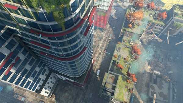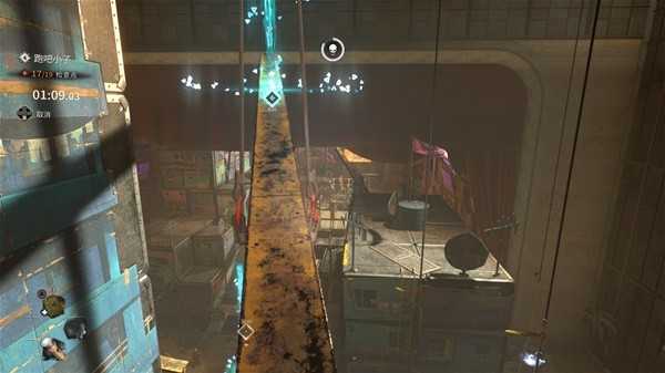 正好近期也在玩《索尼克:边境》,相对于索尼克那个虽然超音速到让我老年人的动态视力完全跟不上的超速冲击感,《消逝的光芒2》这个跑酷大概是由于写实像3D的缘故,“大受震撼”的体验更强了——当然这部分内容仅限于游戏本体在中期以后那些涉及到摩天大楼的跑酷,游戏中由于落地时你只要能碰到绳子、能抓边或者能跳到车顶&垃圾堆&篮网队那个投篮命中率为0%的球员(就是Simmons→床垫)上面,都不会受到任何坠落伤害。来张图给你们体验下(跳楼过程中截图,下面有滑绳可以抓)↓。