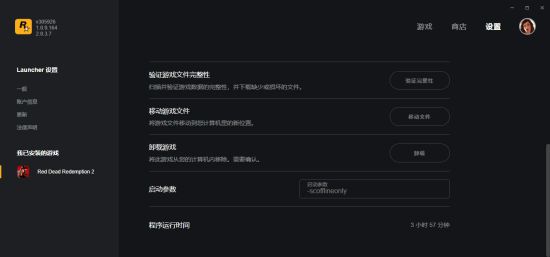 打开R星平台安装好《荒野大镖客2》后,如下图右上方的[设置]选项。然后在[我已安装的游戏]中选择《荒野大镖客2》并找到[启动参数]选项输入-scofflineonly。