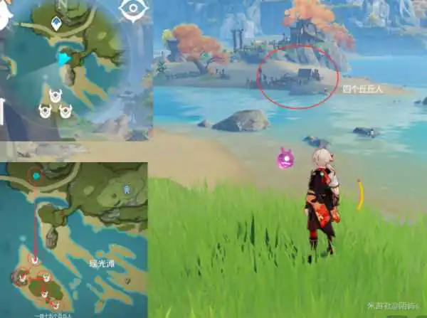 我们回到传送点,这回朝着地图的东方向跑,跑到湖边在对面就有四只丘丘人。