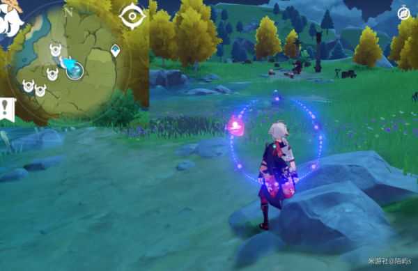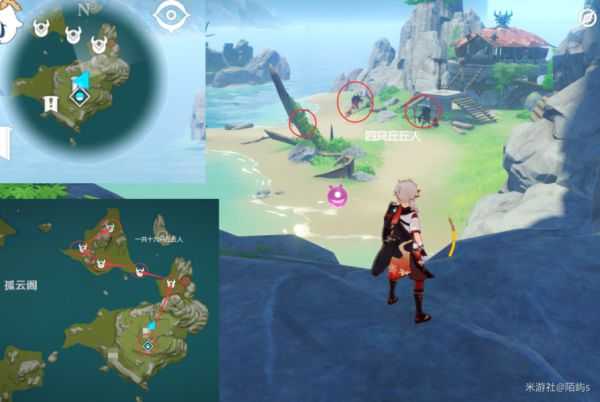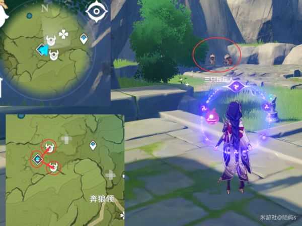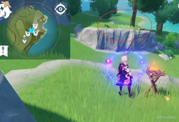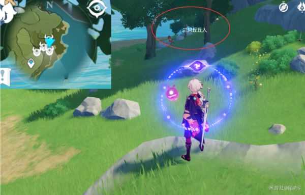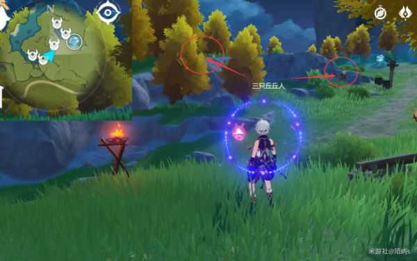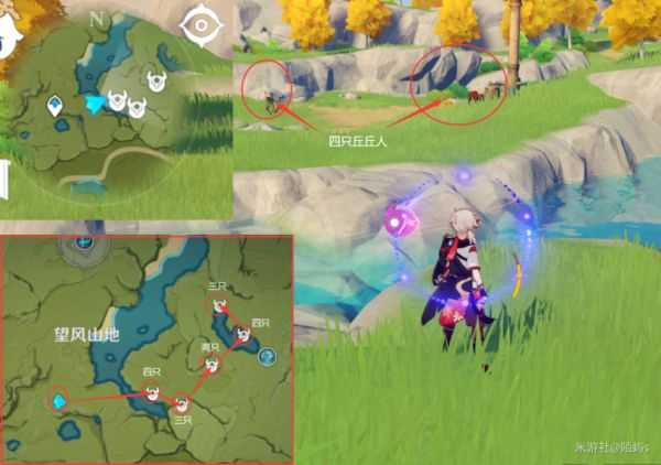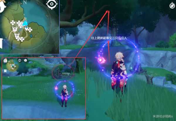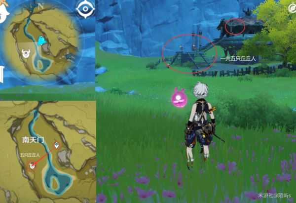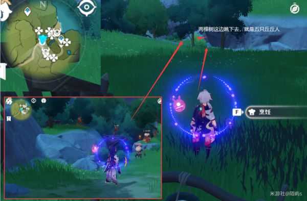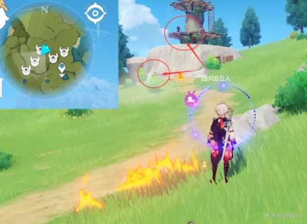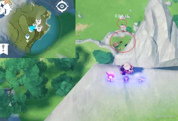 清完朝着地图的南方向跑,两棵树的位置跳下去就是五只丘丘人。