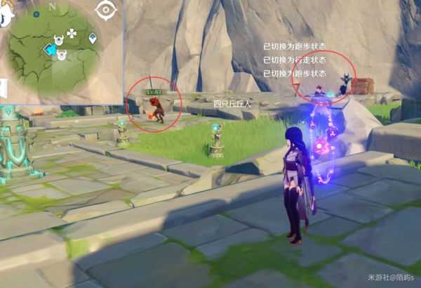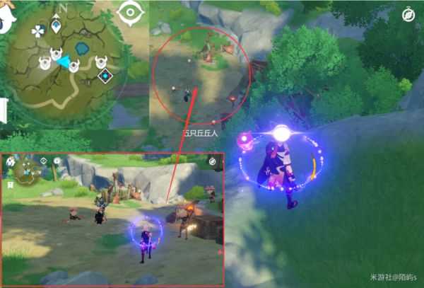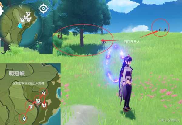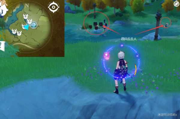 首先我们来到明冠峡下方的传送点,朝着地图北方向看,有四只丘丘人。