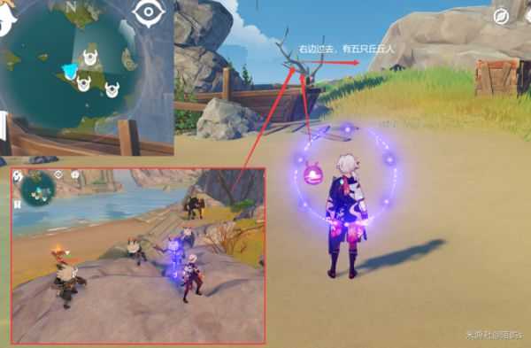 我们来到名椎滩右上角的传送点,朝着地图的东南方向跑,在破船的旁边就有五只丘丘人。