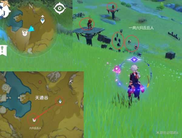 我们来到天遒谷右边的传送点,朝着地图西南方向跑,在前面就能看见六只丘丘人。