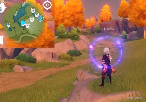 我们来到绀田村左边的传送点,朝着地图的西南方向跑,在下面就有三只丘丘人,对面还有四只丘丘人。