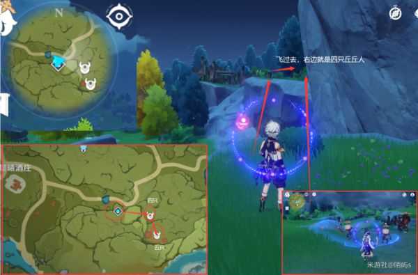 我们来到晨曦酒庄右边的秘境,朝着地图东方向飞,飞上去之后右边就是四只丘丘人。