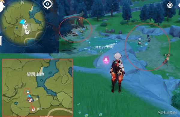 我们来到望风山地下方的传送点,朝着地图的南方向就能看见七只丘丘人。