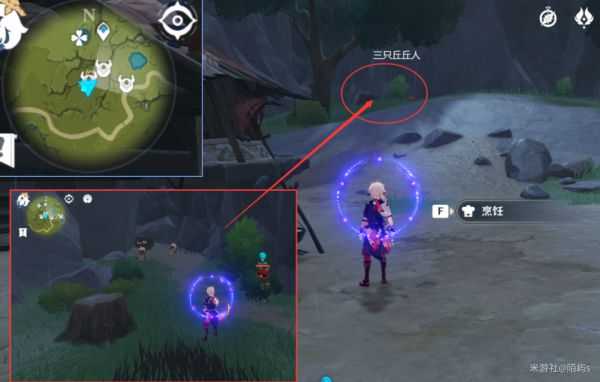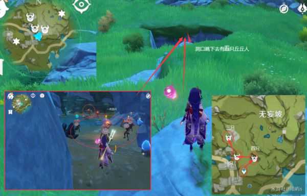来到无妄坡下方的传送点,朝着地图的东北方向看,有个洞口跳下去就能看见五只丘丘人。