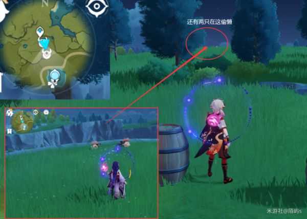 清完朝着地图的东北方向看,左边两只在睡觉的丘丘人,右边一只巡逻丘丘人。