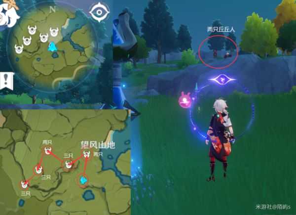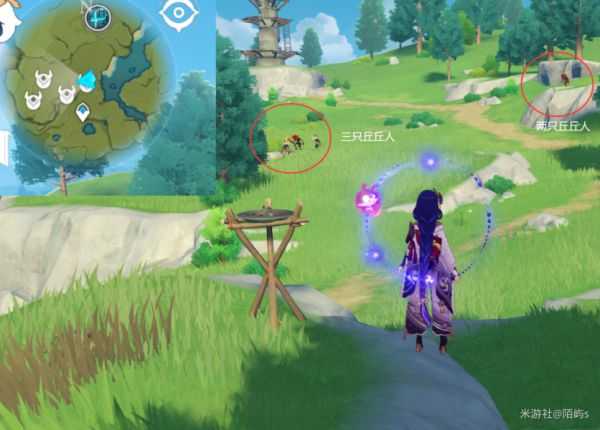 清完朝着地图西方向看,左边有三只丘丘人,右边有两只丘丘人。