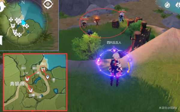 我们来到奔狼领右边的传送点,朝着地图的北方向跑,在前面就能看见四只丘丘人。