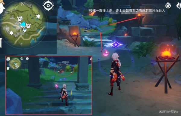 清完朝着地图的西方向走出去,然后朝着楼梯往上跑,跑到楼梯的尽头朝着右边看,就能看见三只丘丘人。