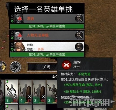 但需要注意的是,单挑开始时会开始倒计时,如果己方将领比敌方将领弱一些,并在单挑中(倒计时结束)活了下来,那么该将领的部曲会因为他在对抗一位更强大的对手时幸存下来而受到极大的鼓舞,同时在一段时间内大幅提高士气,并发挥出更强的战斗力。