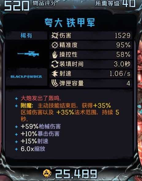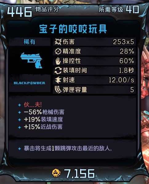 black powder厂,效果是暴击时产生一个小球在敌人头上跳,每跳一下造成一次暴击伤害,数值跟本体暴击伤害一样,一般能跳两下,也就是造成两次额外伤害,有时只跳一下,应该跟命中的角度和hitbox位置有关系。