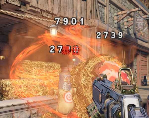 如图,不暴击第一枪伤害是2685,(暴击后触发了角色被动技能,增加了一点伤害)暴击后变成7823(暴击伤害)+2712(非暴击伤害)。同时可以看到,对稻草人暴击的同时,爆炸的AOE伤害对旁边的靶子也造成了伤害。