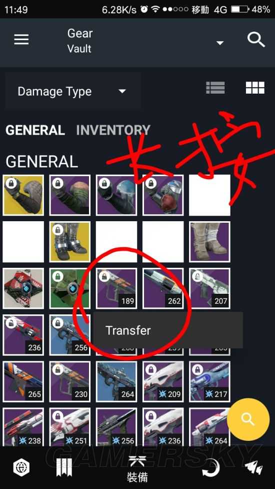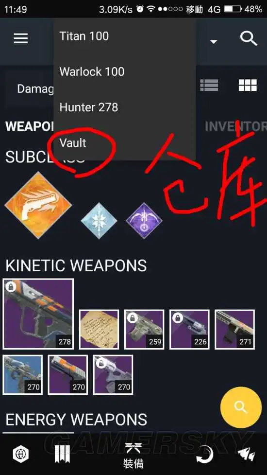 玩过命运的玩家都有这么一个烦恼,就是换装备,进了raid忘记带某把武器,或者某把神器在其他小号上,只能灰溜溜回塔,上小号进高塔仓库倒腾半天,浪费了大量时间。其实官方已经提供了玩家随时随地拿仓库或者小号装备的方法:1.用官方提供的手机app更换(安卓链接:,苹果的自己去商店搜索destiny)。同时手机APP还给玩家提供一个更重要的功能,就是招募队友!安卓app招募设定招募中文玩家请到这里看:,管理装备更换见下面的图: