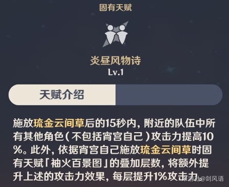 2、突破自身天赋,开大招后提升队伍角色10%攻击力,另外袖火百景图叠的层数,还能额外获得10%攻击力。大招属于脱手技能,同时提升队伍角色伤害。