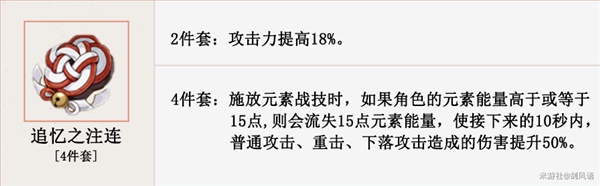 追忆之注连4件套:以普攻输出的宵宫,追忆套实打实提升普攻伤害50%。目前提升的伤害也是最高的,唯一缺点损耗元素能量。