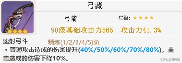 弓藏:这把武器核心在于被动特效,满精炼提升普攻80%伤害,满精炼弓藏的输出是要高于1精炼的阿莫斯之弓,另外四星相对获取也容易,非常推荐宵宫带弓藏。