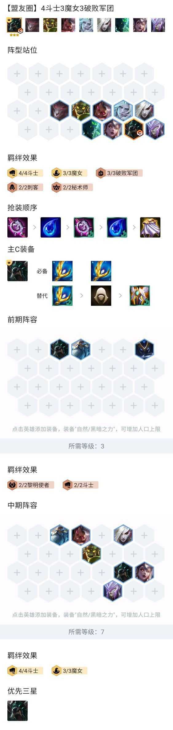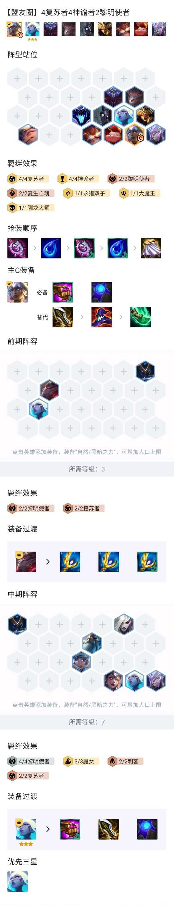 第二种情况就是吸血鬼三星,补复苏魔女就行,这版本吸血鬼加强又多了个六复苏,一个专职就可以实现,这是官方赤裸裸的暗示玩吸血鬼啊,以前吸血鬼都是前期凑四复苏后面换大头的,也确实,我在这个版本回归狂暴后就看到人人都在赌,所以吸血鬼大概率是三不了,但是我们也没指望它三,当狼人追不了三,我们就可以取出大天使给吸血鬼,基本后面大家也会转型吸血鬼前面难拿后面也挺容易的,有四张就给吸血鬼带大天使,奶妈二星了魔女给到奶妈,我们装备6级时肯定都是尽量拿的ap装,直接奶妈主c,法爆无尽蓝buff,轻松赢到7级,不行奶妈也可以带大天使,老规矩是准备4张奶妈,能追三肯定就奶妈主c,不能留准备第三次转型,7级找卡尔玛和小菊,这里提一嘴,7级前大家基本报团站,奶妈收益很高,7级后大家都会分散一下,奶妈没多少容错,还得卡尔玛不用考虑对手站位,卡尔玛还是一件蓝装两件法爆装,大天使这时候可以给到小菊,这套阵容为什么丝滑,因为这装备太好用了,如果来了提莫大头也可以带到ap装,在神谕和复苏中凑出四加二甚至四加四就行,血量大优你咋打都行,卡尔玛最好凑个四黎明,常规阵容是补上狗熊,后期大头或者提莫二星还可以继续进行第四次第五次转型,小菊卡尔玛装备继续交替,谁吃魔女谁主c,这套阵容里唯一不用换的就是魔女,加上这版本武器库和装备拆卸重铸的出现,我只能用丝滑来形容这套阵容。