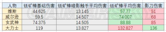 可见,铥矿棒在攻击系数为0.75、1、1.25的角色手中的平均伤害均高于影刀,仅满饱腹的大力士手持铥矿棒稍弱于影刀。另外,通过对比可知暗影触手的附加伤害是不受角色攻击系数影响的,平均每次攻击造成12~15的额外输出,也就是说,攻击系数越低的角色,铥矿棒相对于影刀的收益越大。