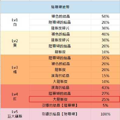以陆珊瑚地带为例,各素材出现的机率如下图