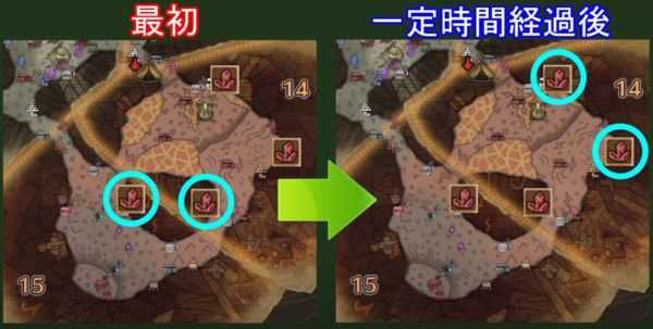 若是初期矿脉出现位置为左图的采集点,而一定时间经过后,则左图的两个矿脉点消失,替换成右图的两个采集点出现矿脉。