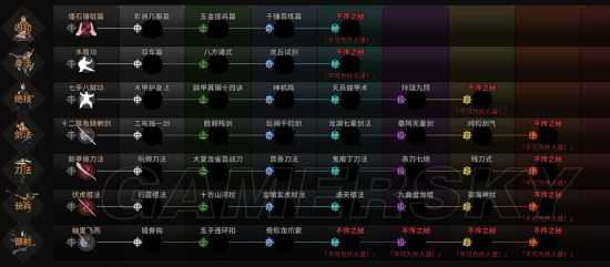 铸剑山庄“不传之秘”总共10个,顺序由上往下,内功-身法-绝地-XXX
