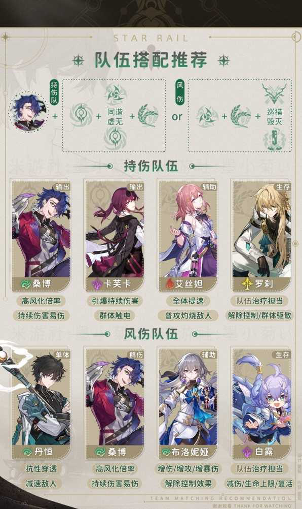 持续伤害队:桑博在当前一般作为风属性“对群”输出使用,“持续伤害”队伍由于少了“暴击区”,整体输出相比“直伤”会低一些,而「卡芙卡」机制上能够引爆敌人身上的“持续伤害”,让“持续伤害”队伍有了一个主心骨,与桑博搭配也是比较合适的选择。
