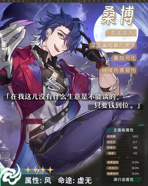 桑博作为主打“持续伤害”的角色,虽然其人设以及“持续伤害”目前较为平庸的强度让很多开拓者没有花费资源去培养,但随着“卡芙卡”的登场,我相信拥有优秀“持续伤害”机制的他表现会越来越好。