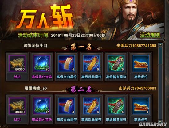 由于开服第二天就要进行万人斩活动,这绝对是一个旷日持久的战斗,一定要充满精力的从头刷到尾。所以建议这之前一定要存很多国战义兵,援军,冲锋令,这些都有助于你再万人斩活动中脱颖而出,第一名的奖励值得看的是20个高级强化珠,第二名是15个,第三名10个,参与奖是2个。为了更好的刷兵,建议手动寻敌,累一点但是效率更快。还有就是用悬赏令,结算杀敌增加100%,事半功倍。可以看到流氓头目刷了100亿,大家可以学习一下。