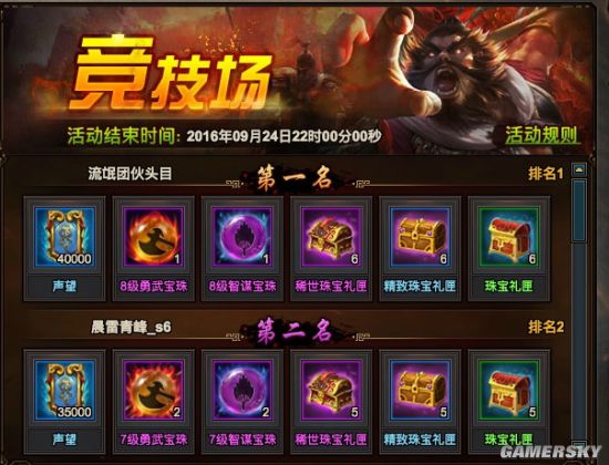 竞技场就是硬碰硬实力的对决了,建议一开始不要有太高的排名,等到最后快结算的时候,高BUFF吃起狂点前面的人,这个没啥技巧,有手速就行。奖励如下。第一名的流氓以400W战力战胜了500W的晨雷,靠的就是疯狂的手速。