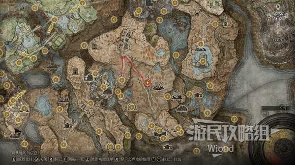 然后沿着下图所示路线走到右侧的【穆斯废墟】位置。