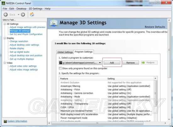 随后点添加一项,也就是红框中所圈中的一项(我用的英文版,所以大家凑活看吧)。随后将Dayz的执行文件dayz.exe添加进去,通常在Steam\SteamApps\common\dayz 下