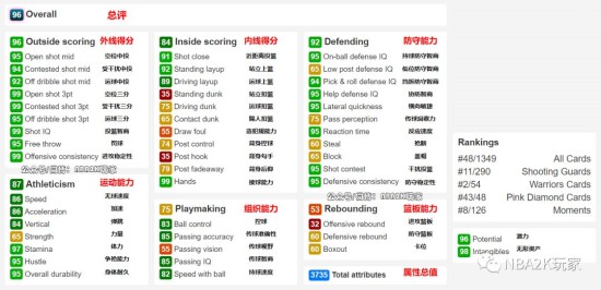 进攻端这张卡的外线投射能力给到了极致,中投三项95左右,三分三项中空位三分和受干扰三分直接拉满,运球三分给到了95,大部分投射类小项都在95以上,简直可怕;内线进攻能力一般,除了常规的近距离和上篮之外,扣篮和背身能力较为有限。