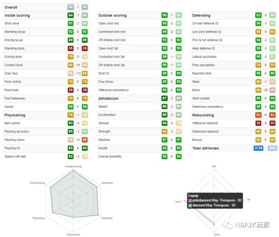 这张粉克莱的属性总值为3735,六大项中有两项高光(外线得分、防守能力),两项绿区(内线得分、运动能力)、一项黄区(组织能力)和一项红区(篮板能力)。