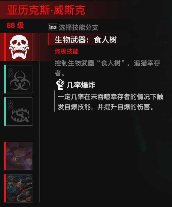 终极技能介绍:食人花拥有生命值并可以被消灭,被幸存者消灭后会增加15秒生存时间。食人花的『几率爆炸』技能是指可以直接使用『自爆』(600点伤害)技能;『自爆』不会当做被消灭处理(不增加生存时间),切换回摄像头的速度也较快。食人花可以在使用『自爆』的同时使用除终结技以外的其他招式。