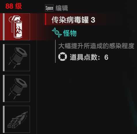 PS:使用以上技能和道具的组合搭配可以使感染气体型的丧尸在什么都不做的情况下,只用感染气体即可在5秒内导致幸存者进入1级感染;普通爪击2次后可以立即致使幸存者进入1级感染;啃咬可以直接2级感染。