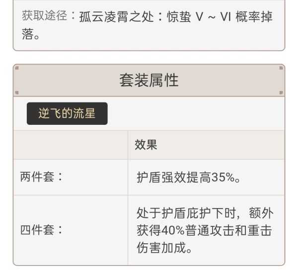 1.逆飞的流星二件套提供35%的护盾强效能能为诺艾尔站场提供直接收益,这点优于角斗士二件套的攻击力加成