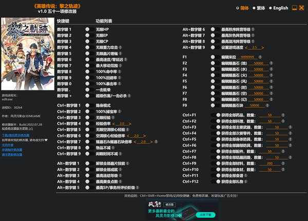 简体、繁体、English,可以切换语言(切换语言后修改器将把该语言设置为默认语言)