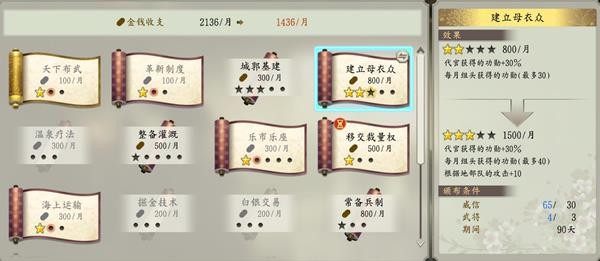 政策执行:包含功勋获取方向(天下布武、母衣众等)、知行自主方向(政策革新、移交量裁权等)、设施强化方向(乐市乐座、常备兵制等)、城防方向、军粮强化、城防强化等。