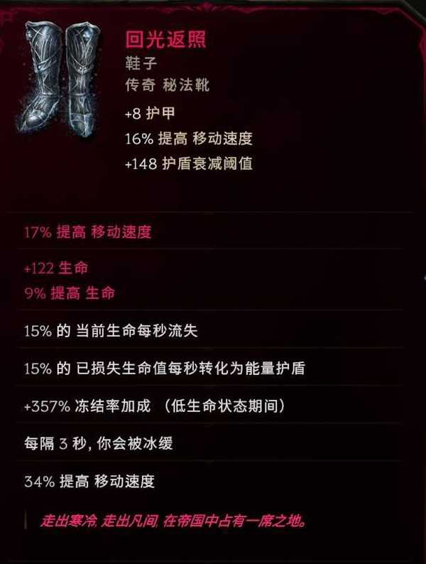 利用冻伤镣铐最后一条属性将冰霜抗性(包括括号里的部分)转化为等量的护盾维持,来放大低血两件套获得的护盾。