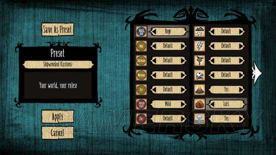 别以为这个地图很简单,其实真的非常难,难到几乎连作死都没机会,不信?你可以按照我的地图设置一个世界,给你用超神的威尔逊(其实用饥荒本置的15个角色任何一个都可以)能活上5天你就可以来找我评评理了