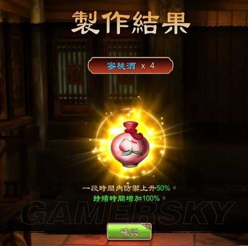 同时,如果在酿造结束的时候,指示光标停留在中间“适中”这一档的上方(允许有些许的偏离),且玩家的酿酒级别足够,那么酿造出来的酒的数量有非常大的几率可以翻4倍(也就是一份材料酿4瓶),详见下图。