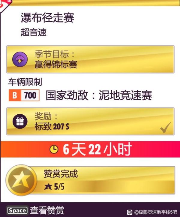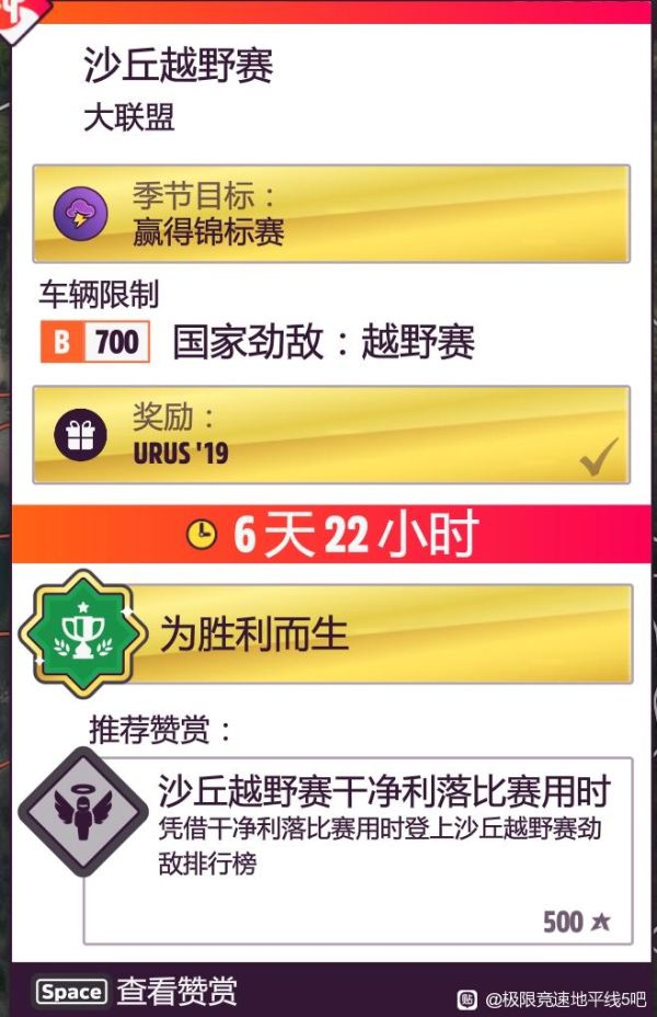 讲实话,Horizon里面看到最烦的就是越野赛。还有四代沙滩车也是个毒瘤赛事。飞坡越多不可控因素越多,先说缺点车身较重整体手感偏厚重,起步提速较慢。刹车没改,所以刹车点最好提前,尤其冲刺图。优势可能就落地时偏稳,急速不低 图1 沙丘越野赛 基本第一个大飞坡后第一个弯道不出意外能拿到前3名后面稳住慢慢超车就行。录屏时直接飞到了第一名,整体没啥难度。