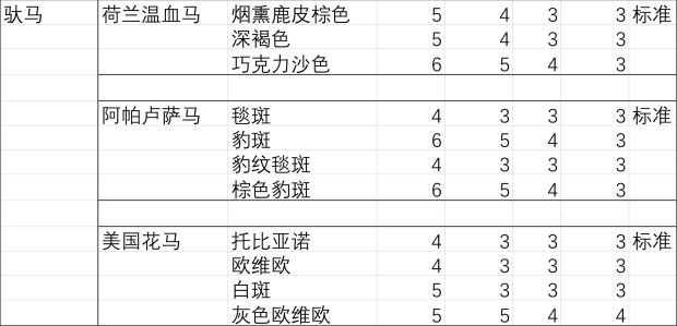 注意:美国标准种马中的银尾鹿皮棕色的掌控为标准级别,其余赛马掌控都是赛马级别。