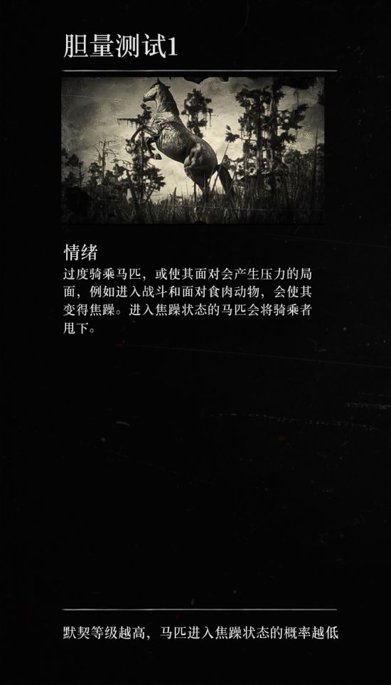 经测试我认为,马匹是存在胆量这一说的,但是并不是靠马匹的种类来区分,而是靠马匹的默契度。默契度越高胆量越大。