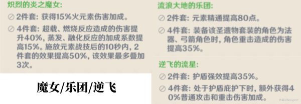 ①. 圣遗物在套装上首选【炽烈的炎之魔女】4件套,其次也可以选择【流浪大地的乐团】4件;