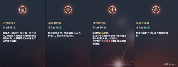①1命为烟绯的核心命座,优于烟绯需要持续站场并且以普攻作为输出方式,因此这一命座十分关键,可以减少重击时的体力消耗以此增加重击释放次数;