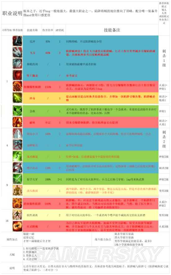 为什么猎人和火只点一点,因为这能够最大化保持物理贼的战斗能力而不破坏陷阱贼的输出,毕竟要狂怒。狂怒还有一个好处,飞刀雨能保证每下都暴击,正常情况下一般很难保证个个背刺。符文上物理符文,记得给武器淬毒就行了。扔陷阱记得先抹个毒,高刺杀高战场保证贼在物理方面也非常强横。在测试中发现一个技能在捉弓箭手时非常强大——破坏。本招在引爆各种箭头时伤害就是武器面板,在别人背后引爆还能背刺暴击,故伤害极高。最重要的是只要1ap,十个弓箭手8个炸的是魔法箭,1个击倒或者减速箭,还有一个没有箭。1ap等于武器面板的输出!你还在犹豫什么,甚至你可以靠扒窃和交易把东西塞别人背包用来引爆,十分强横!