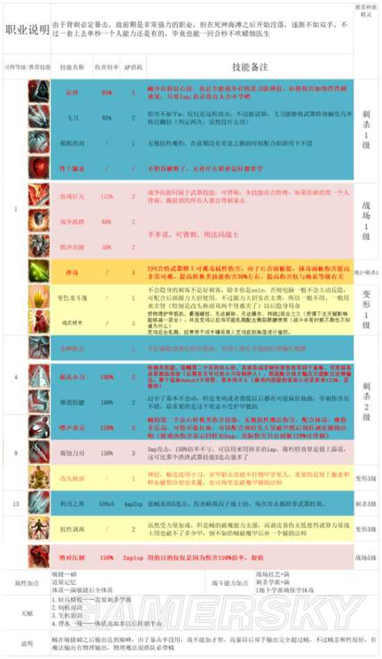 首先看到这两张图加点与技能组合,物理贼主刺杀战场,陷阱贼主刺杀火系。但是,我们可以让贼专修刺杀,满刺杀后满战场,神射刺杀满足技能需求(都只点一点,能放单陷阱就够了,一般都能秒杀,打特殊boss洗一下换也可以)。在物理贼基础上我们可以多学一个陷阱和狂怒。狂怒之后暴击率满,在此之后用飞刀引爆陷阱(陷阱要狂怒之前放),陷阱每次爆炸都能暴击!并且暴击倍率受刺杀影响,在高刺杀情况下火抗一般的都是直接炸死,比较高的也是残。特别高的?为什么要炸他,拿刀去砍啊!